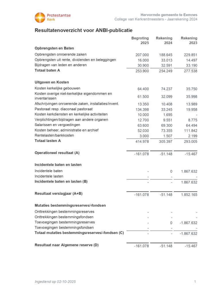 De Protestantse Kerk heeft van de Belastingdienst een groepsbeschikking ANBI gekregen. Dat wil zeggen dat de afzonderlijke gemeenten, diaconieën en andere instellingen die tot dit kerkgenootschap behoren zijn aangewezen als ANBI. Dit is ook van toepassing op de college van kerkrentmeesters van de hervormde gemeente te Eemnes.